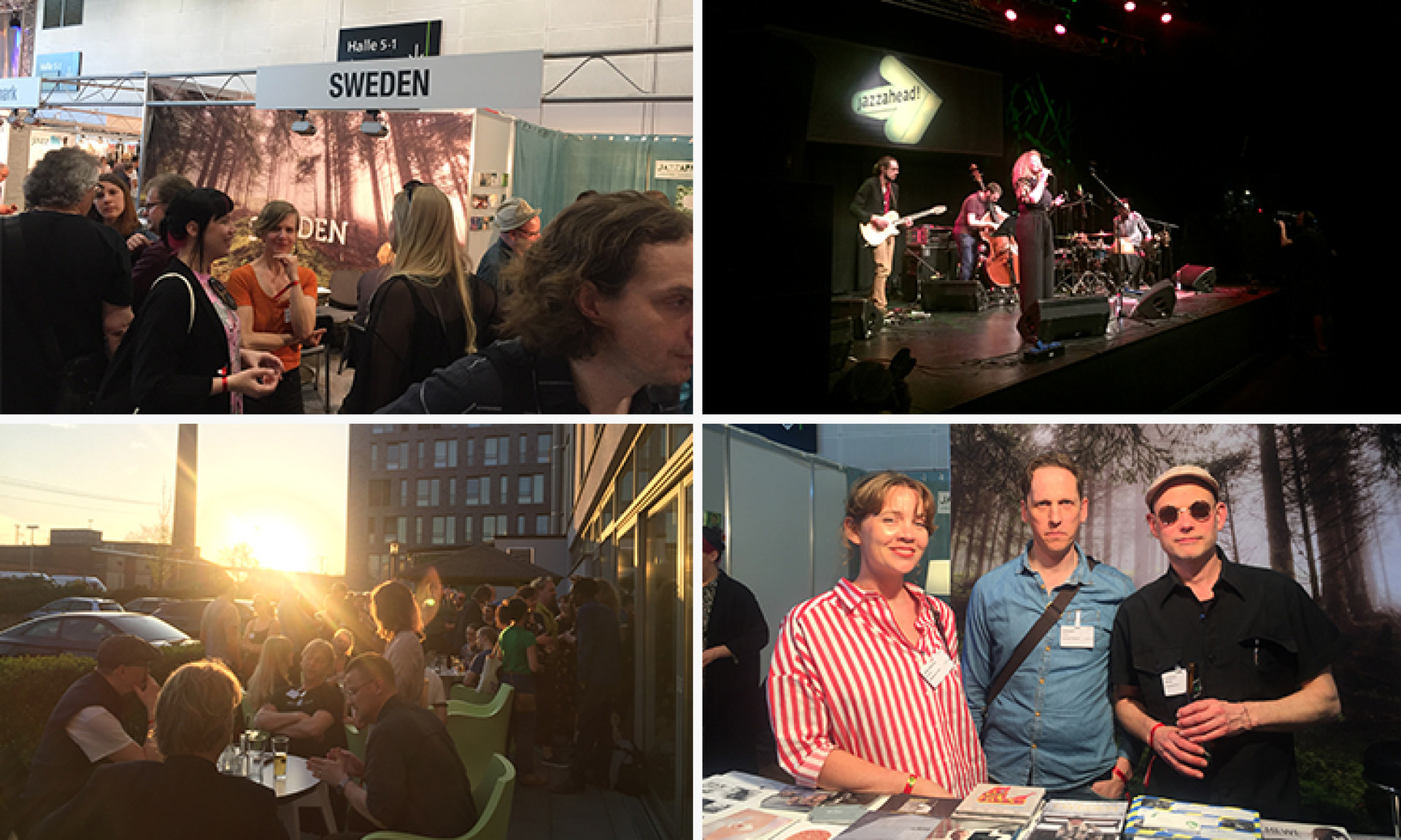 Bild 1, svenska montern. Bild 2, Emilia Mårtensson med band på scen. Bild 3, nordiskt Get Together. Bild 4, Carolina Wiehe Welroos från Musikcentrum Syd, Anders Vestergård från Drumvoice Records & Mathias Landaeus, musiker.
